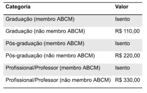Os valores da taxa de inscrição seguem a tabela apresentada. Para membros ativos da ABCM, a inscrição será isenta. Para os participantes não membros, o pagamento da taxa deverá ser efetuado até 04 de setembro de 2026, por meio do link de pagamento que será disponibilizado em breve.